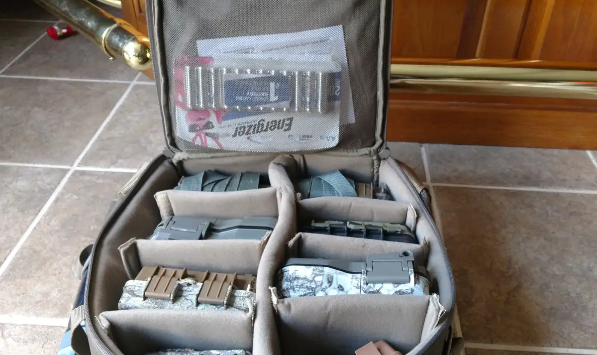 As for the trail camera straps, I personally take them off the camera and place them in a side pocket of the bag. If you prefer to keep your straps with the camera, wrap the camera straps so that the buckle is against the back of the camera and the strap is wrapped covering the lenses. This will protect your lenses from being scratched by the buckle and other trail cameras.